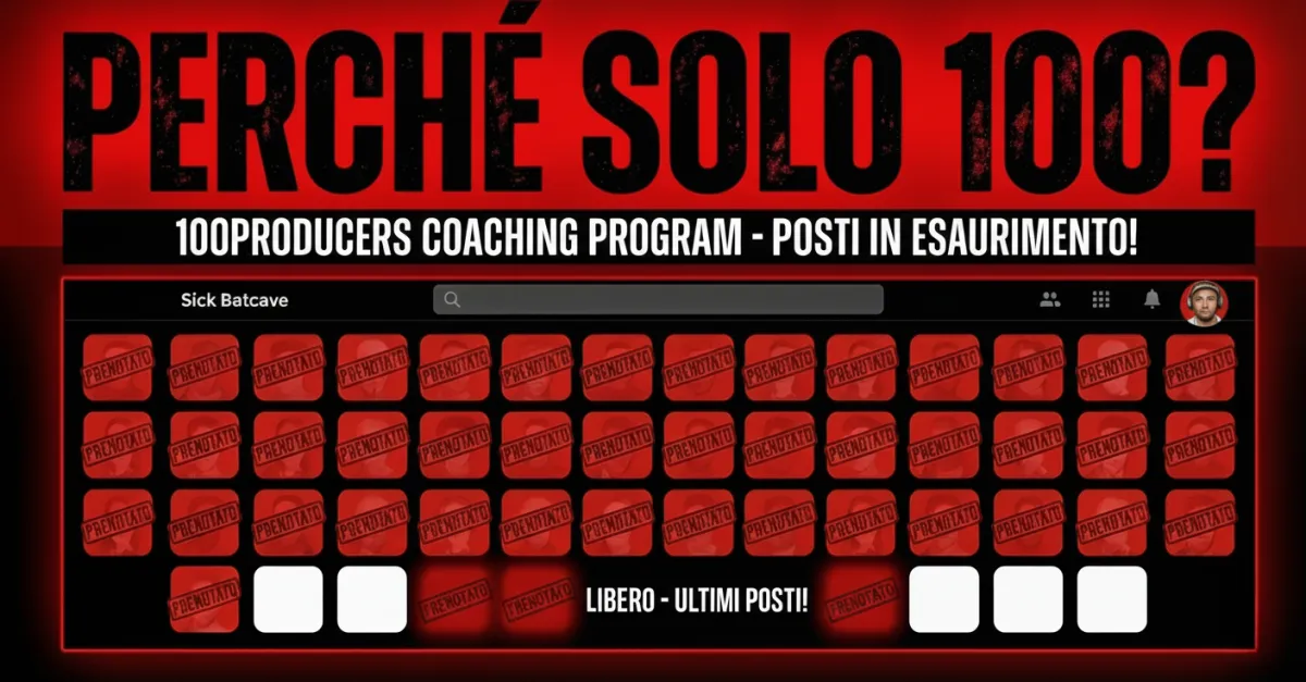 I posti per 100PRODUCERS sono estremamente limitati. Se non sarai selezionato, purtroppo perderai un'occasione unica per accedere ai segreti di Sick Luke e alla sua formula di successo. Chi resta fuori continuerà a combattere in mercati al ribasso, dove produttori mediocri svendono beat per pochi euro, e a perdere tempo cercando invano di farsi spazio senza una strategia concreta per distinguersi.